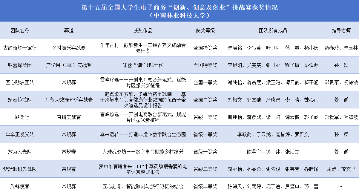 【林大网讯】(文/经济管理学院)8月6日,第十五届全国大学生电子商务“创新、创意及创业”挑战赛全国总决赛圆满落幕。我校在比赛中荣获全国特等奖2项、一等奖1项、二等奖1项,湖南省一等奖3项、二等奖2项。